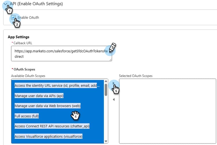 https://app.marketo.com/salesforce/getSfdcOAuthTokensRedirect. Markera alla tillgängliga OAuth-scope och klicka på högerpilen för att lägga till dem.