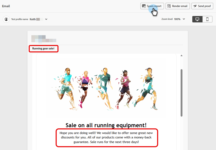 Om du anser att poängen är för höga kan du redigera ditt innehåll i e-postmeddelandet i Designer baserat på rapportens resultat och sedan köra skräppostrapporten igen.