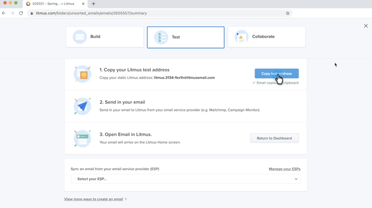 Hämta testets e-postadress i ditt Litmus-konto genom att klicka på knappen Kopiera testadress på skärmen Testa.