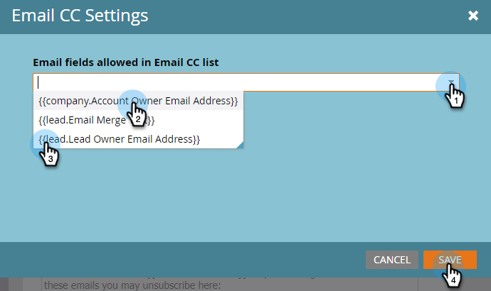 Välj upp till 25 Marketo lead- eller företagsfält (av typen "E-post") som ska vara tillgängliga som CC-adresser i e-postmeddelanden. Klicka på Spara när du är klar.