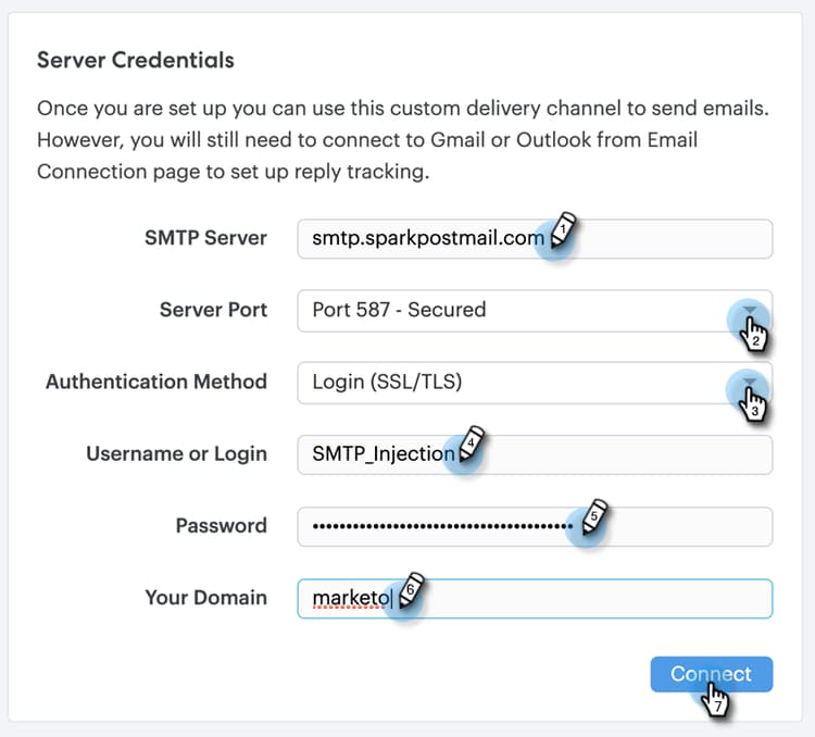 Med Marketo Sales Connect kan du integrera med en anpassad SMTP-server för att leverera dina e-postmeddelanden. Det här är ett bra alternativ för dem som inte vill skicka massutskick från sin Gmail eller Exchange-leveranskanal.