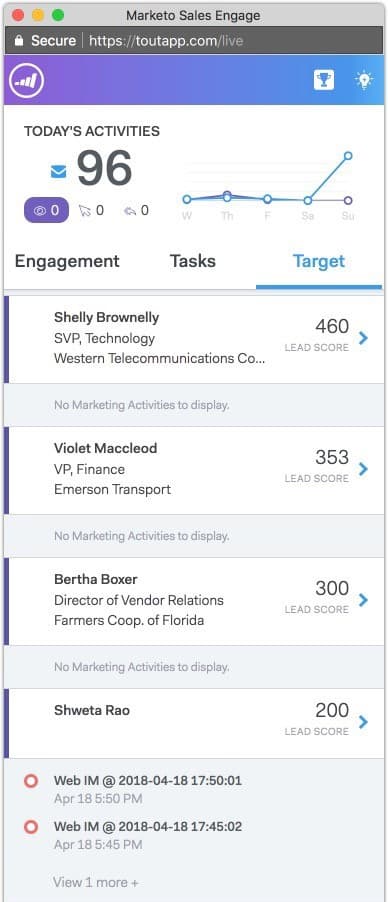 Se de översta personerna (ordnade uppifrån och ned) rankade efter lead-poäng. Ledpoängen dras över från er Marketo-instans.