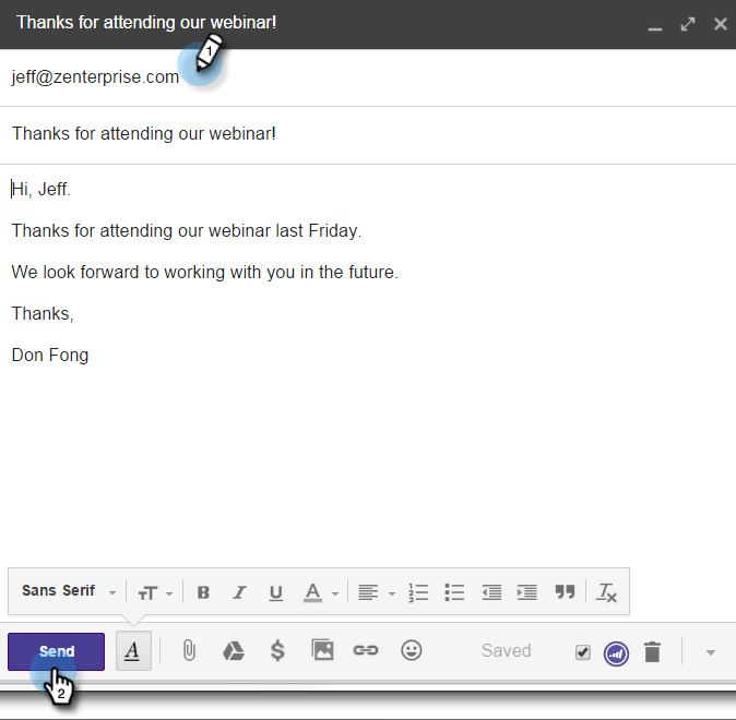 Skicka-knappen har fått Marketo lila! Det här e-postmeddelandet skickas nu med Marketo, alla länkar spåras och en spårningspixel infogas i e-postmeddelandet. Detta registreras som en skickad e-postaktivitet.