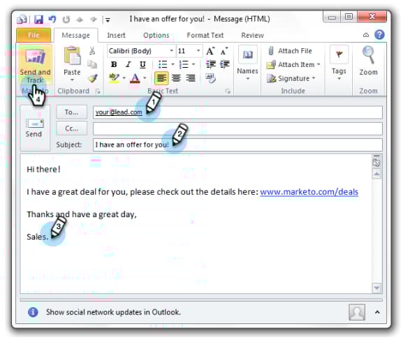 Så enkelt är det! Även om det här e-postmeddelandet skickades av en säljares Outlook spåras det i Marketo.