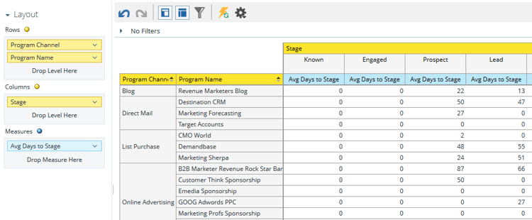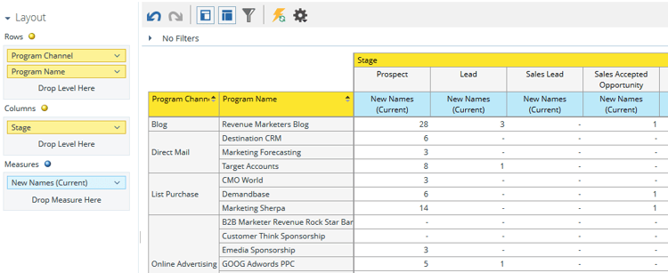 I det här analysområdet kan du analysera effektiviteten i enskilda program eller se summerade resultat per kanal. Här får du insikt i hur många av de nya namnen som har genererats har nått vissa framgångar inom modellen för intäktscykler.