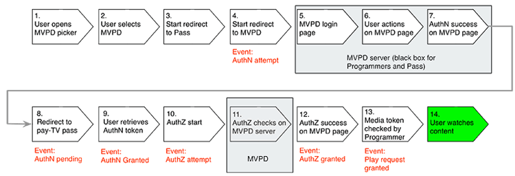 Som framgår av diagrammet ovan aktiveras autentiseringshändelserna endast när användaren gör en rundtur i MVPD. Autentiseringshändelser innehåller inte cachelagrade tokenautentiseringar.