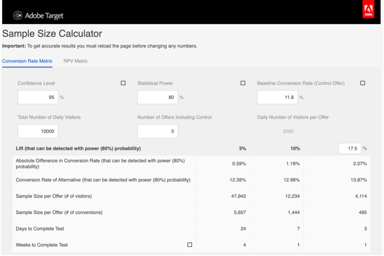 - Gå till Adobe Target-kalkylatorn för urvalsstorlek.