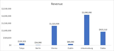 Vi har sex modeller och kan jämföra intäkterna för varje modell. Vi ser att Johannesburgmodellen har störst intäkter, medan Berlin har minst.