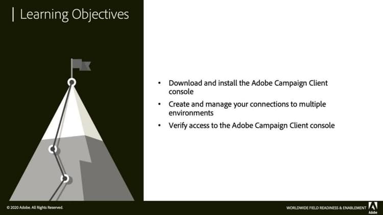 Lär dig hur du hämtar och installerar klientkonsolen i Adobe Campaign, skapar och hanterar anslutningar till flera miljöer samt verifierar åtkomst till klientkonsolen i Adobe Campaign.