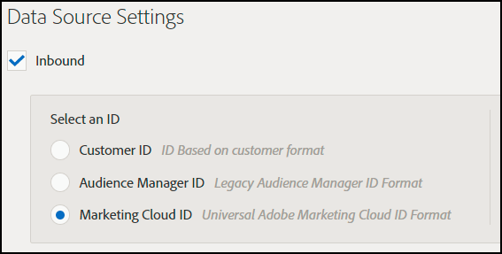 Data Source Type。在Audience Manager UI中创建目标时选择此选项。 首先,选择Inbound,然后选择所需的ID类型。 选项包括: