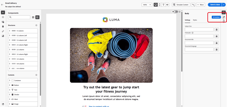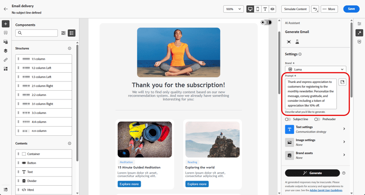 它提供电子邮件模板的变体,并生成和重新生成图像。 在本节中了解有关AI助手的详细信息。 Adobe Campaign v8具有AI助手,可用于电子邮件、短信和推送。