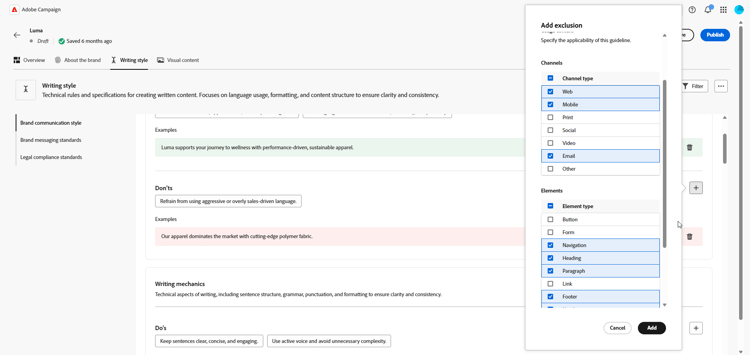 渠道类型:选择应用此准则、异常或排除项的位置。 例如,您可能希望特定书写样式仅显示在电子邮件、移动设备、打印或其他通信渠道中。