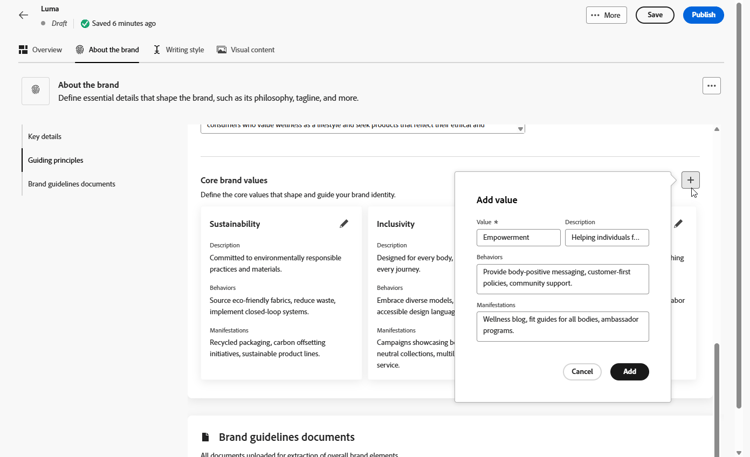 使用 关于品牌 选项卡建立品牌的核心标识 — 概述其用途、个性、标语和其他定义属性。