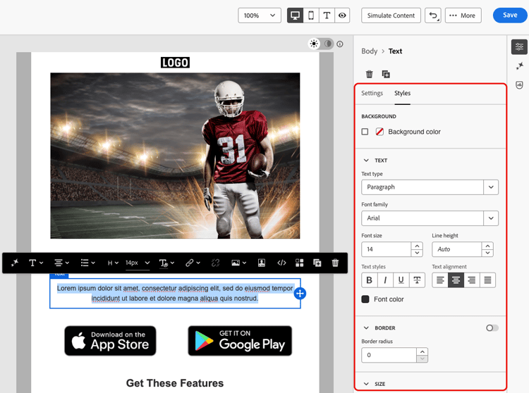 在Adobe Campaign中,可以使用Email Designer 样式窗格中的样式参数和属性进一步细化内容中不同元素的大小和间距。 了解详情