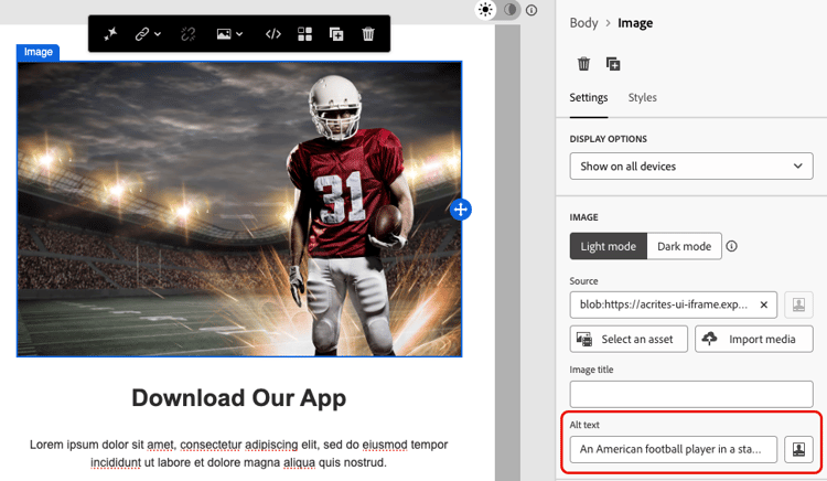 Adobe Campaign 电子邮件Designer允许营销人员为 电子邮件 和 登陆页面 生成内容,并允许您根据Web内容无障碍准则(WCAG) 2.1和AA级轻松遵守此指令。