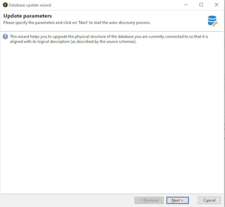 要应用对架构所做的修改,请启动数据库更新向导。 可以通过 Tools > Advanced > Update database structure 访问此助手。 它检查数据库的物理结构是否与其逻辑描述匹配,并执行SQL更新脚本。