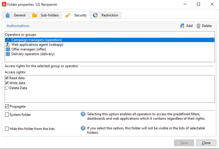 要传播授权和访问权限,请选择文件夹属性中的 Propagate 选项。