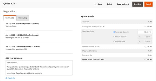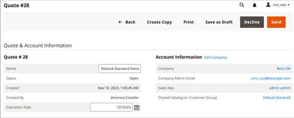 当您发送报价时,系统会通知买方和管理公司帐户的销售代表。 电子邮件中包含指向买方帐户中报价的链接以及报价的到期日期。 在洽谈过程中,采购员可以执行以下任何操作: