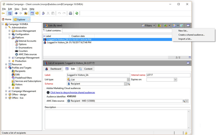 要与营销活动共享AMC受众,一旦在Adobe Campaign中创建了区段,必须在AAM中完成配置。首先,在Adobe Campaign中创建共享受众,然后从区段列表中选择AMC区段。必须在campaign中根据MID和声明的ID创建两个共享受众。配置完成后,这些区段即可被视为自动映射到AAM中的相应目标。