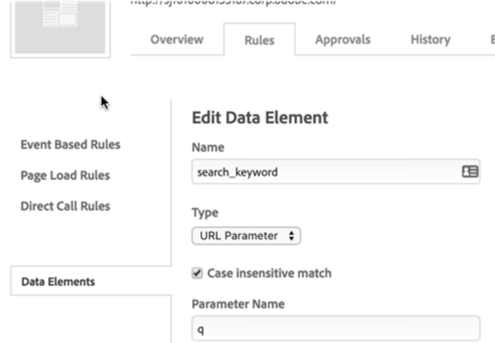 在以下用例中,您在 evar2, 中捕获了所使用的搜索关键词,并且在Analytics中将产品购买作为购买事件。以下流程基于AA调用到AAM的服务器端转发。在搜索页面上,您捕获了"q"参数并将其放入数据元素中: