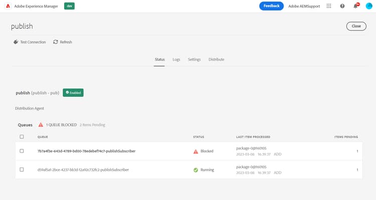 当尝试使用快速Publish、管理发布或复制来复制页面内容、XF或其他资源时,创作实例上的分发队列会被阻止。 您可以通过检查分发UI (AEM > Tools > Deployment > Distribution)中的 发布 分发队列来进行验证。 按照本文档中提供的步骤解决问题。