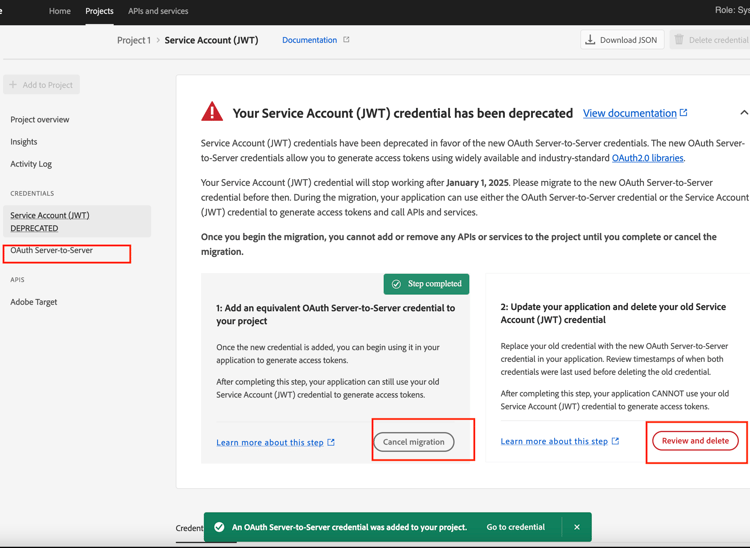 新凭据 OAuth服务器到服务器 已添加到左侧。 如果要取消迁移,请单击取消迁移。 验证新凭据 OAuth服务器到服务器 是否正确工作后,单击 查看和删除 按钮。 并删除JWT凭据以完成迁移。