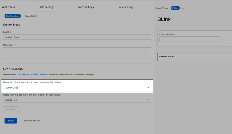 - 如果有分节符,请检查查看分节中的字段所需的访问权限。