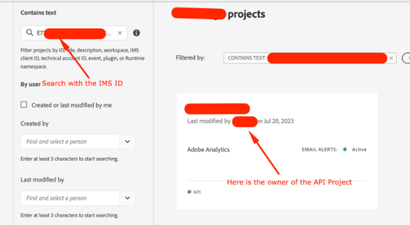- 转到API项目管理UI。 使用您复制的IMS ID搜索API项目。 然后,您就可以在发现的API项目中查看所有者信息。