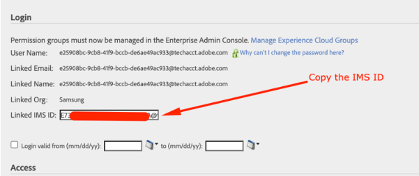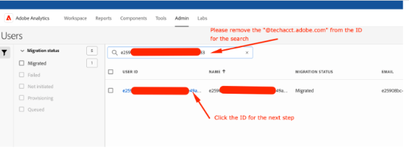 >Analytics用户和资产UI。 将您之前复制的技术帐户电子邮件ID粘贴到搜索栏中,并找到该ID以查找对应的链接IMS ID。 -
