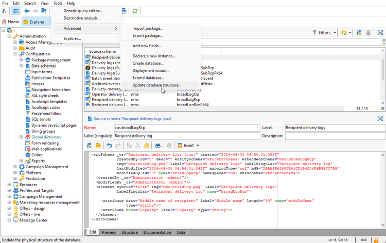 要应用对架构所做的修改,请通过工具 > 高级 > 更新数据库结构启动数据库更新向导,并运行更新数据库结构。 了解详情