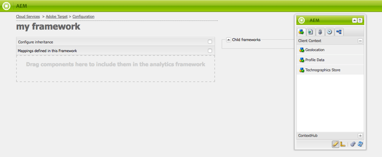配置 Target 云配置后,可以添加 Target 框架。框架标识从可用的Client Context或ContextHub组件发送到Adobe Target的默认参数。 Target 使用参数来确定适用于当前上下文的分段。