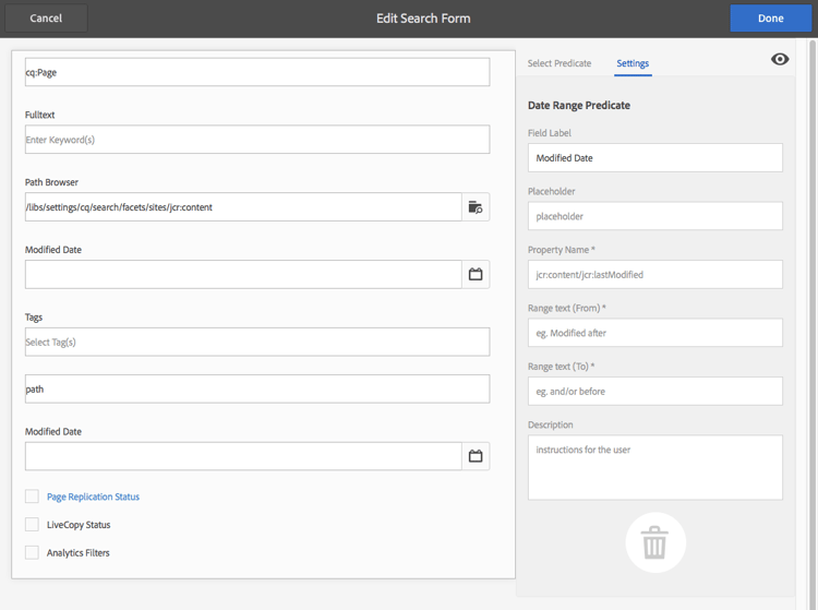 使用 搜索Forms 可以自定义搜索面板中使用的搜索谓词选择,这些面板可在各种AEM控制台和/或创作环境的面板中使用。 自定义这些面板可根据您的特定需求使搜索功能通用。