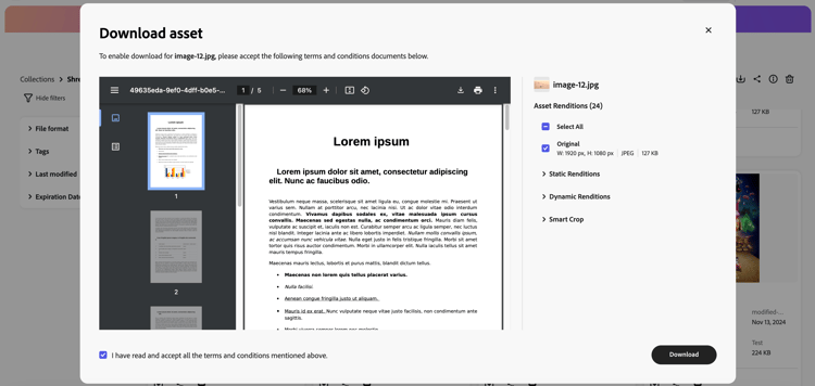 下载,然后在 下载资源 对话框中查看选定资源的列表。 单击资产旁边的 以将其从列表中取消选择。 选择一个或多个格式副本并单击 下载 以将它们下载为单个ZIP文件。 选择 智能裁切 和 静态演绎版 可下载每个所选资源的所有可用静态演绎版和智能裁切演绎版。
