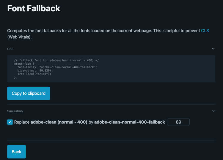 选中该框后,将直接在页面中用计算的回退字体替换自定义字体。 文本输入允许您更改size-adjust值并立即可视化结果(每次更改值时都需要切换复选框)。