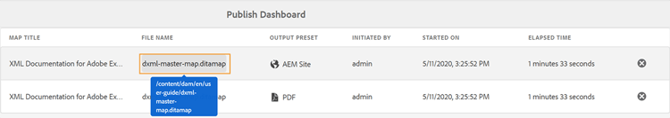 当系统中运行大量发布任务时,几乎不可能单独检查每个DITA映射以监视其发布任务。 AEM Guides为管理员和发布者提供系统中运行的所有发布任务的统一视图。 发布功能板中提供了所有活动发布任务的列表。