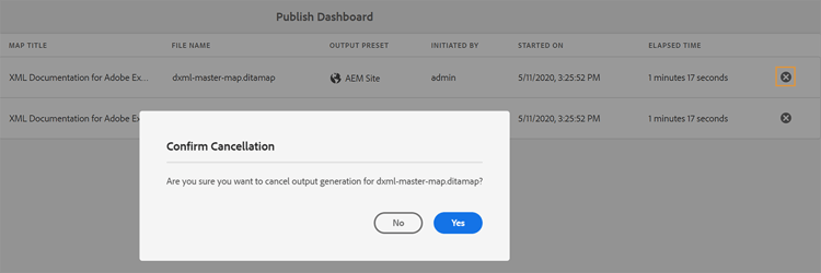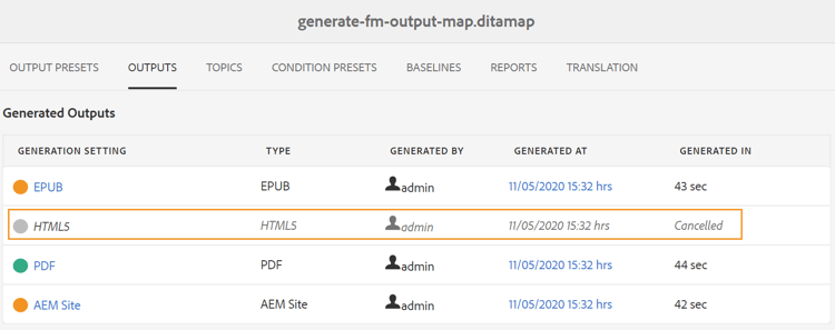 只要任务保持活动状态,就会接受取消命令并尝试取消。 任务成功终止后,将从当前活动任务列表中删除该任务。 任务状态也会在DITA映射控制台中更新为“已取消”。 在以下屏幕截图中,HTML5任务已从发布仪表板取消,其状态也在DITA映射控制台中更改。