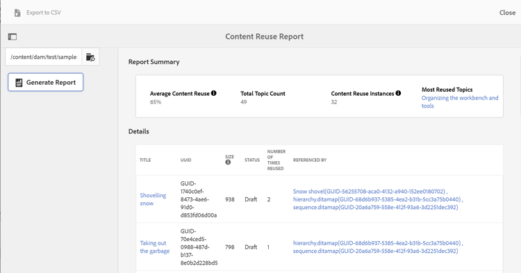 可以生成的另一个有用报告是“内容重用报告”。 此报表计算平均内容使用百分比,这对于项目经理和业务所有者查看正在重复使用的内容量非常有用。