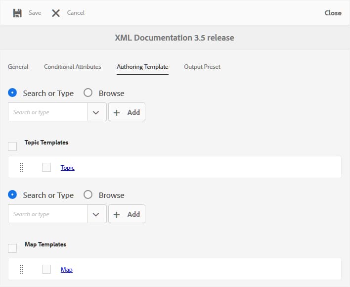 AEM Guides允许您在企业(global)级别和文件夹级别配置创作\(topic或map\)模板、输出模板、条件属性和Web编辑器配置。 这样,您就可以分离企业中不同部门或产品的配置。