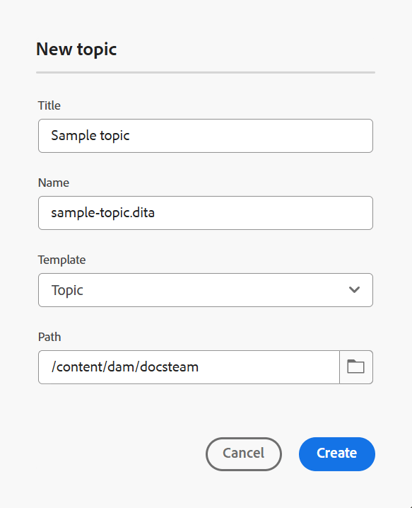 如果文件命名选项可用,则也会根据文档的 标题 自动建议该名称。 如果要手动指定文档名称,请确保 名称 不包含任何空格、撇号或大括号,且以.xml或.dita结尾。 默认情况下,Experience Manager Guides会将所有特殊字符替换为连字符。 查看最佳实践指南中的文件名部分,了解有关命名DITA文件的最佳实践。