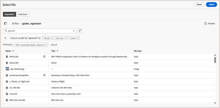 通过文件路径浏览器,您可以快速定位并选择内容存储库中的特定文件。 此功能可用于向映射添加主题、链接图像或交叉引用、创建可重用内容等任务。