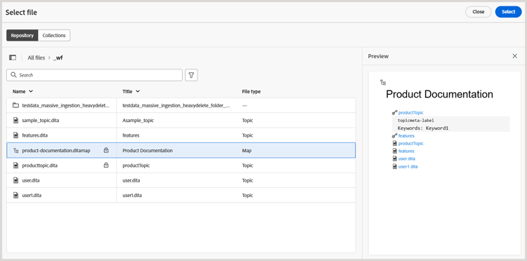 目前,多个文件选择可用于可重用内容、主题引用、架构、输出预设(使用DITAVAL)和Workfront。