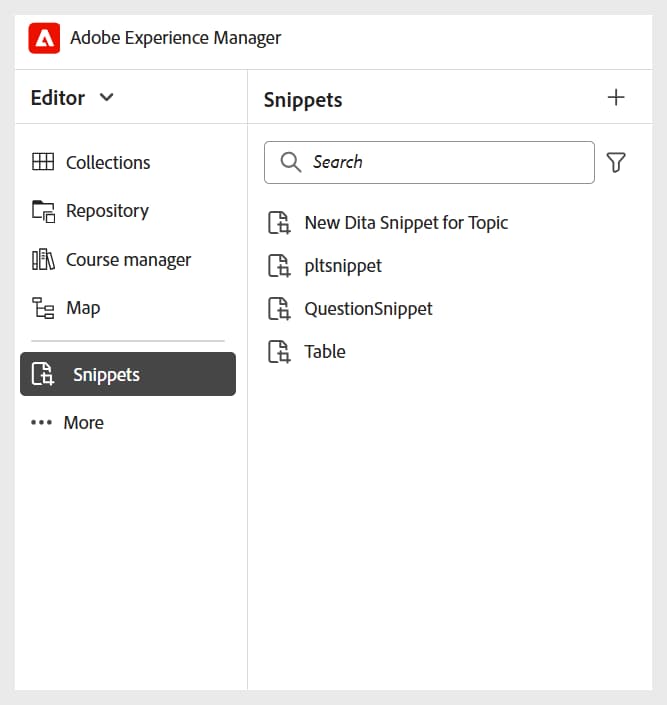 代码片段:您可以在文件夹级别配置代码片段,以确保作者可以访问正确的代码片段。 只有管理员可以在Experience Manager Guides中创建代码片段,然后作者可以在编辑器中使用该代码片段。