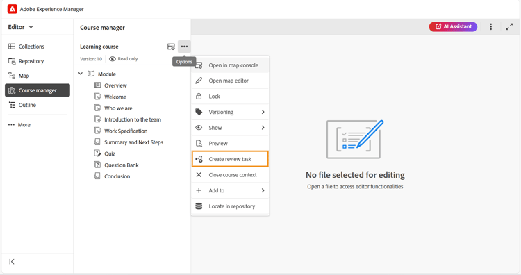 创建审核任务:您现在可以为学习课程创建审核任务,并将其分配给审核者征求其反馈。 这可以确保内容质量、简化协作并简化跟踪审查。