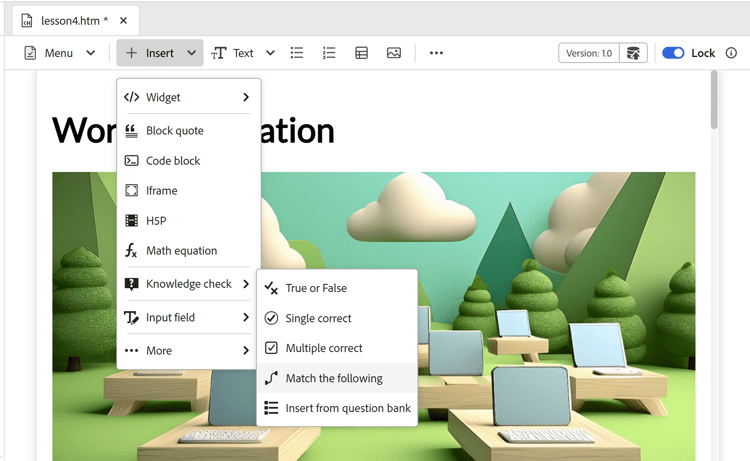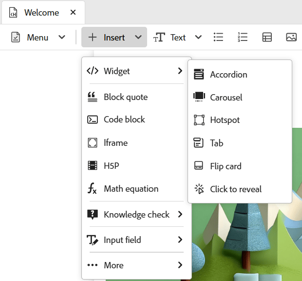 “插入”菜单中的新选项:在编辑器工具栏的“插入”菜单中引入新选项以丰富您的学习内容: