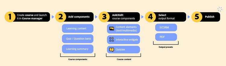 作为作者,您可以使用可用的课程模板创建课程。 然后,通过添加关键组件(如概述、主题、测验、摘要或组)来构建课程。 这些组件集中在一起,并通过直观的创作界面得到增强,其中内容通过文本、多媒体、交互式小部件和评估进行了扩充,从而创造了一种引人入胜的学习体验。
