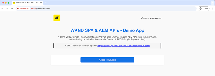 WKND SPA是一个基于React的单页应用程序,它演示了如何安全地获取特定于用户的访问令牌并直接从客户端与AEM API交互。 它通过Adobe IMS实施OAuth 2.0 PKCE身份验证流程,并与两个关键AEM API集成: