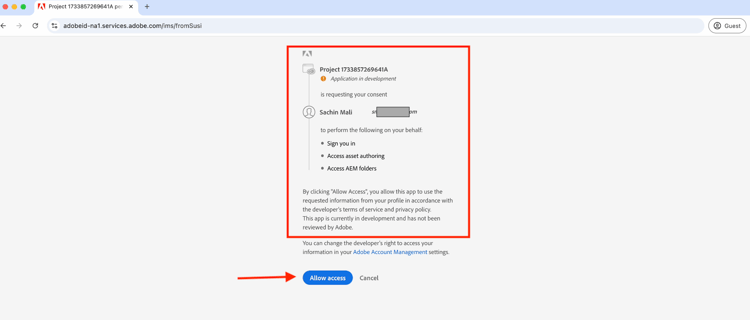 使用您的Adobe ID凭据登录,并提供允许WKND-PIM Web应用程序代表您访问Assets创作API的同意。