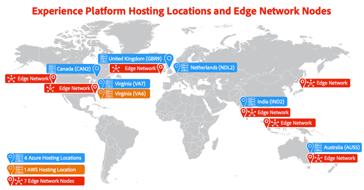 Experience Platform位于六个Microsoft Azure托管位置、一个Amazon Web Services (AWS)托管位置,并通过分布在全球的七个Edge Network节点将数据路由到Adobe服务。