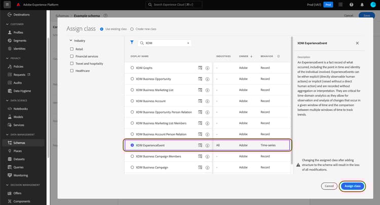 出现一个对话框,其中显示所有可用类的列表,包括您的组织定义的任何类(所有者为“Customer”)以及Adobe定义的标准类。