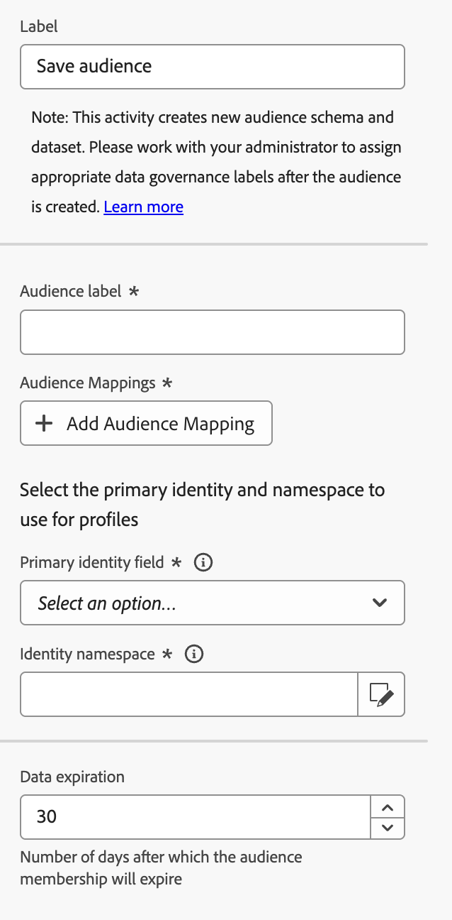 将 保存受众 活动添加到合成后,您可以指定新创建受众的名称。
